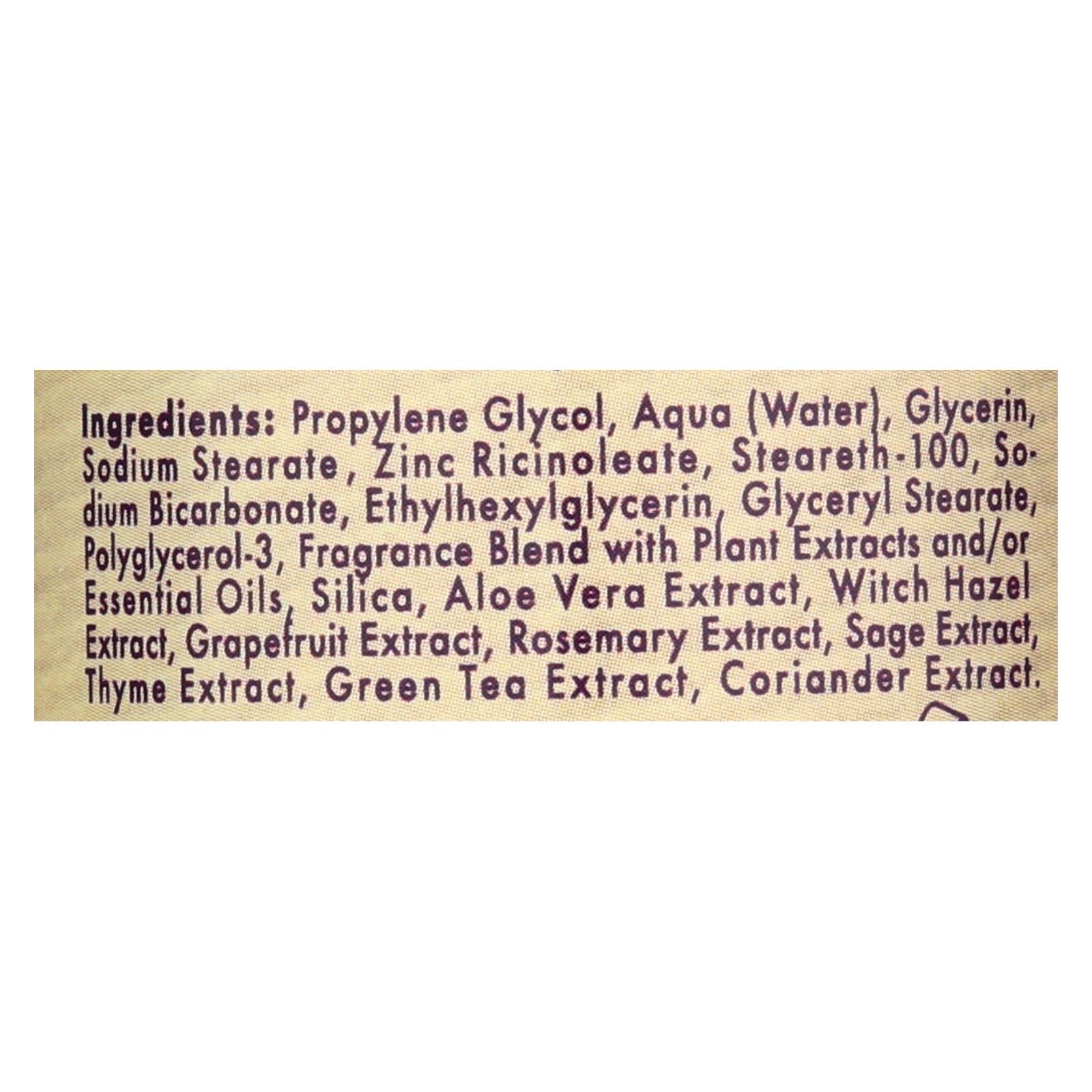 成分:丙二醇、水、水、甘油、硬脂酸钠、蓖麻油酸锌、硬脂醇聚醚-100、碳酸氢钠、乙基己基甘油、硬脂酸甘油酯、聚甘油-3、植物提取物和/或精油香料混合物、二氧化硅、芦荟提取物、金缕梅提取物、葡萄柚提取物、迷迭香提取物、鼠尾草提取物、百里香提取物、绿茶提取物、芫荽提取物